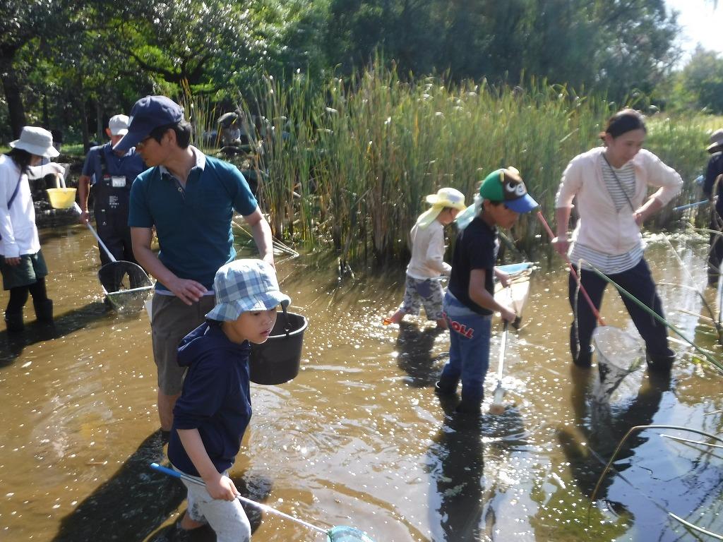 園内にある野鳥の池に入って水辺の生き物を観察しよう