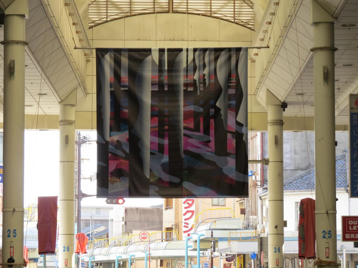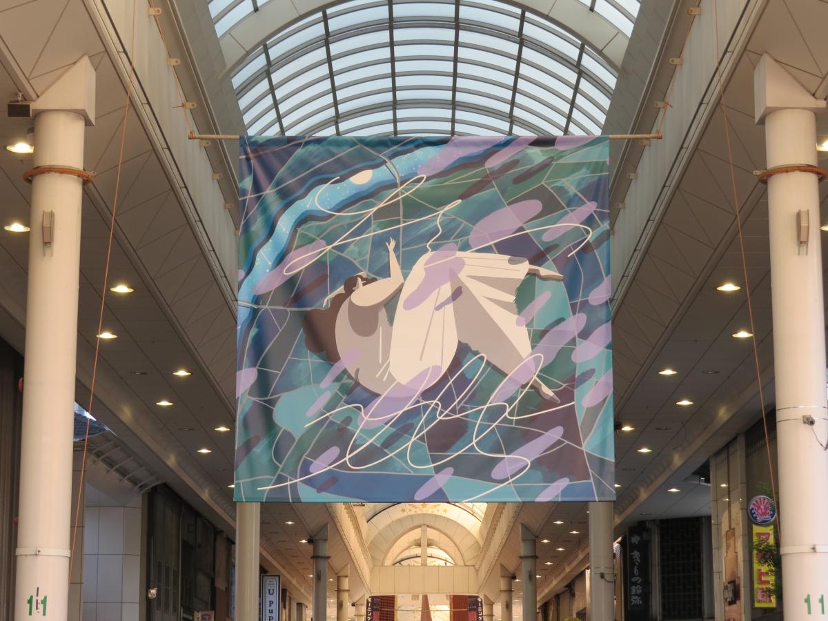 愛知県在住の美術家、グラフィックデザイナーの鷲尾友公氏が描き下ろしたBISHU FES.オリジナルのフラッグがアーケードに掲げられます。