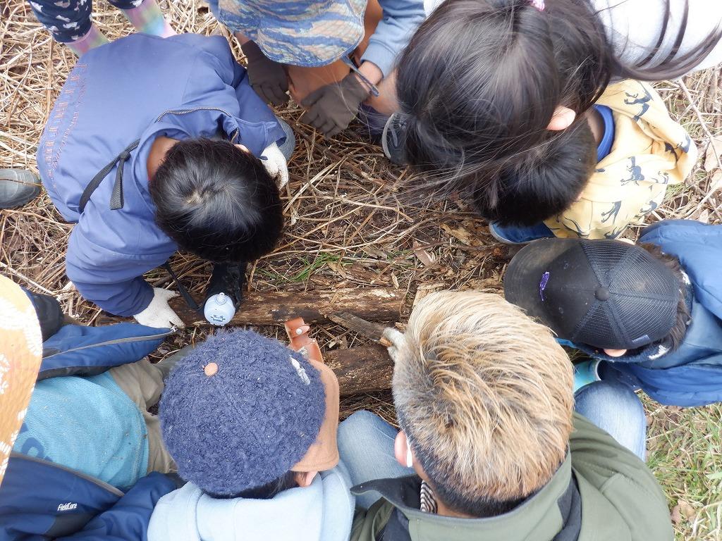 バイオネスト(園内の発生材で作った生き物のすみか)に生息する生き物を観察する。