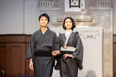 続いてランウェイを歩いたのは、Tシャツやカジュアルなロリィタ服、浴衣など尾州生地でできた服を身にまとった夫婦、母娘など一般の方たち。テーマの「家族みんなで尾州」のとおり、誰もが素敵に気持ちよく着られる尾州服の魅力を伝えていました。