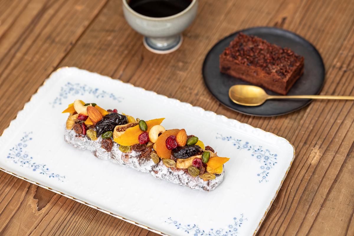 店のおすすめ「ソシソン フリュイ」は、熟成されたドライフルーツと ナッツが詰まったフルーツケーキです。
