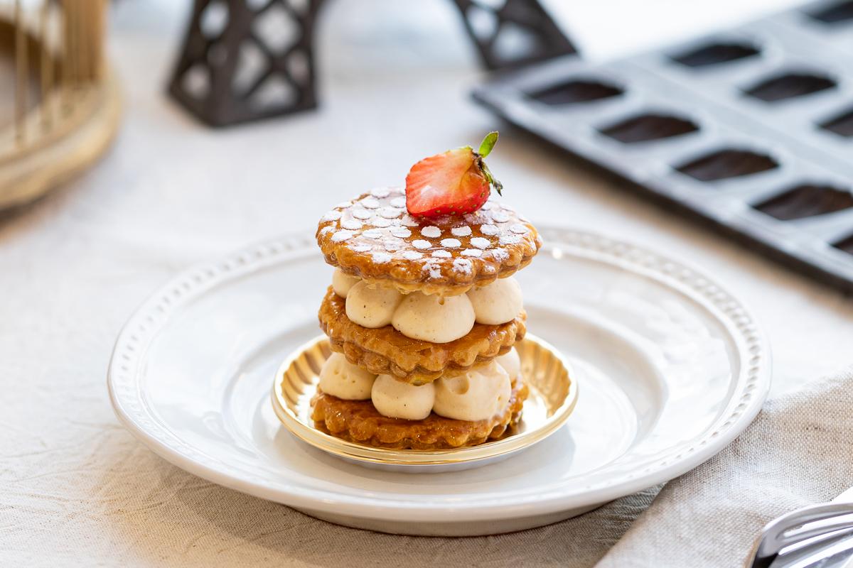 季節限定の「ミルフィーユ」は、サクサクのパイ生地の間に、旬のフルーツ と自慢のカスタードをたっぷりとサンド。満足感の高いお菓子です。