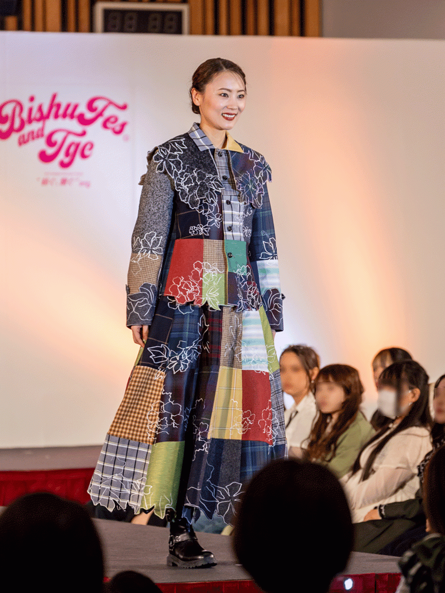 「コンテストは、デザインの良し悪しではなく、趣旨を上手く汲み取った作品が受賞すると思っていたので、自分の作品は頑張って制作したものの、このコンテストで受賞する作品ではないと思っていました。今後は、生地の生産者に話を聞き、生地を使用した意味を消費者に伝えられるデザイナーになりたいです。」(村田さん)