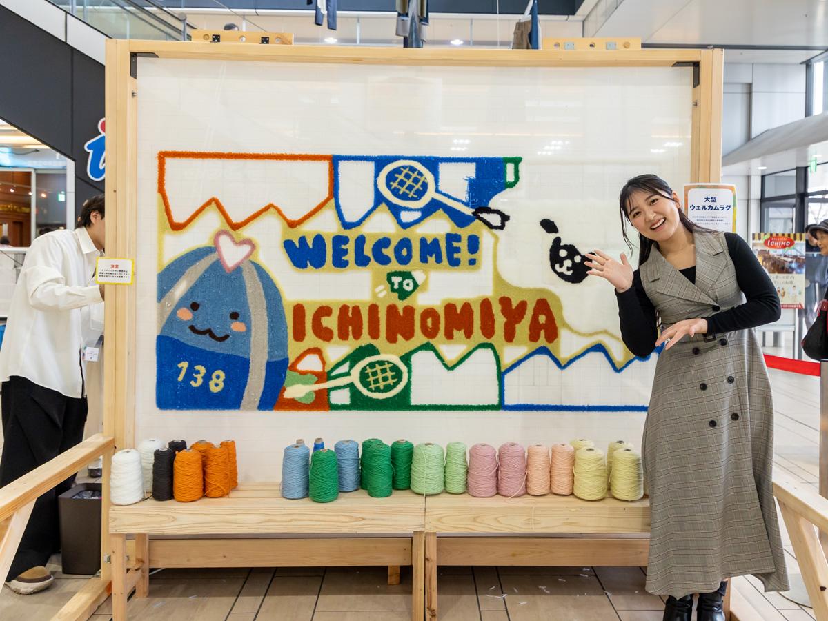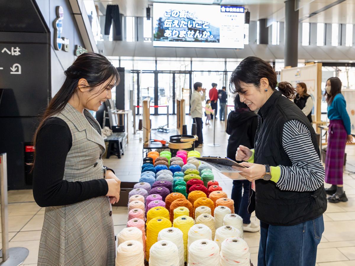 一宮の玄関口である尾張一宮駅前ビル(i-ビル)1階コンコースで行われたのは、小川染色株式会社によるタフティングワークショップ。タフティングとは、専用のタフティングガンという道具で立ったまま布に毛糸を打ち込んでいく、近年SNSで話題のクラフトワークです。