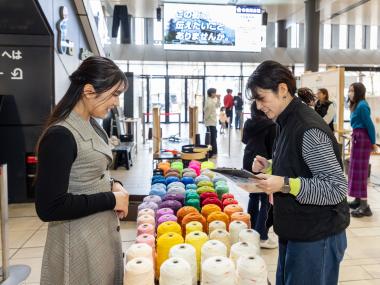 このワークショップのもうひとつの魅力は、各企業から提供された、シルク入りなど高級で珍しい毛糸が1玉100円という破格で販売されていたこと。手芸好きが競うように購入し、尾州のものづくりに触れる良い機会となっていました。穴場です!