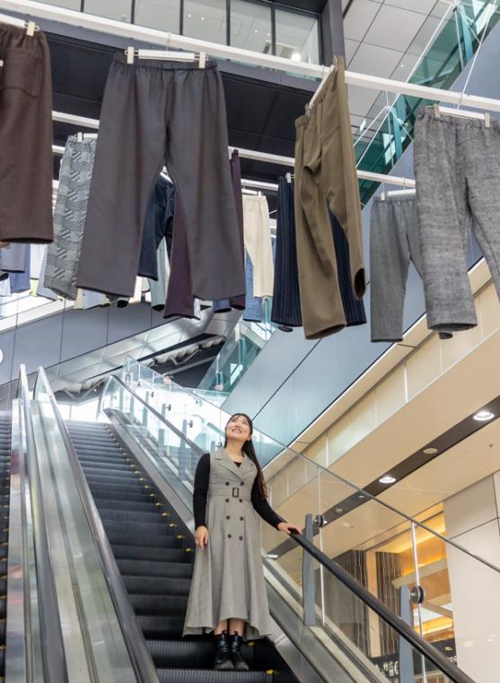 エスカレーター上に尾州らしい服がずらりと並ぶこの景色は、まさにその言葉どおり、私たちに見せたいと願ってきた“彼らの夢”が形になった瞬間だったように思います。