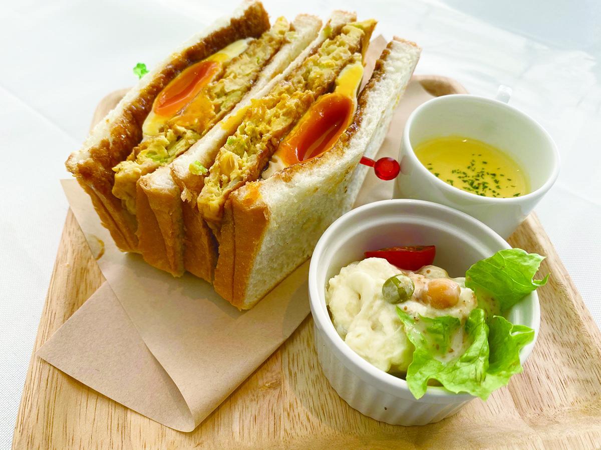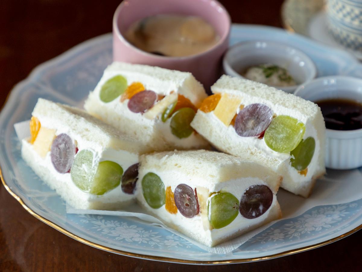 SNSでも話題の「フルーツサンド」のスペシャルモーニング(+550円)は、季節のフルーツがぎっしり詰まった贅沢なサンドイッチに、ミニサイズの茶碗蒸し、ポテトサラダ、ゼリーが添えられたお得なセット。