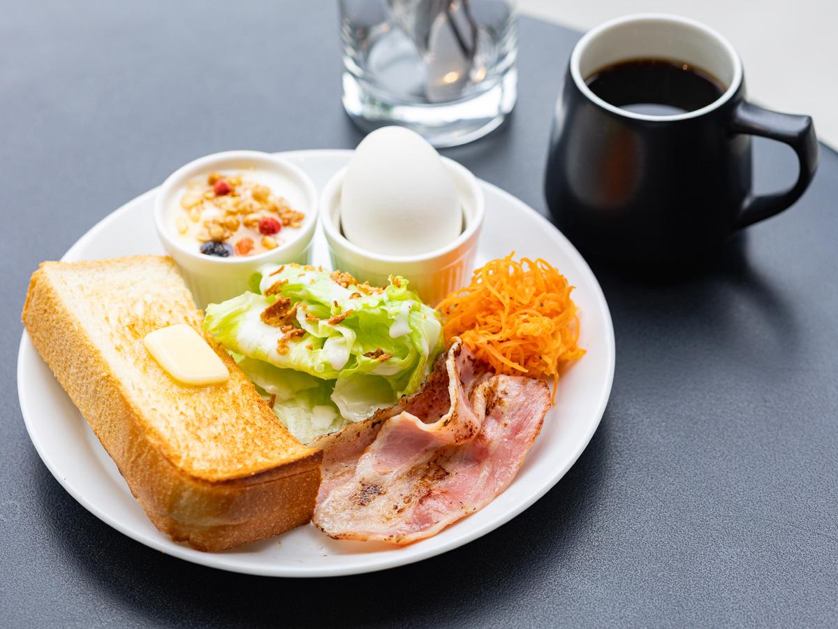 軽めのトースト、サラダ、ベーコン、浮野養鶏のゆで卵、グラノーラ入りヨーグルトを組み合わせたバランスの良い朝食です。コーヒーの酸味が苦手…という人も、焙煎士がおすすめしている各国の“浅煎りコーヒー”をぜひお試しあれ。浅煎りならではのフルーティな香りと甘み、まろやかさが調和する一杯は、これまでの浅煎りのイメージを一変してくれるはず。豊かな朝の目覚めにぴったりです。(モーニング提供は12時まで)